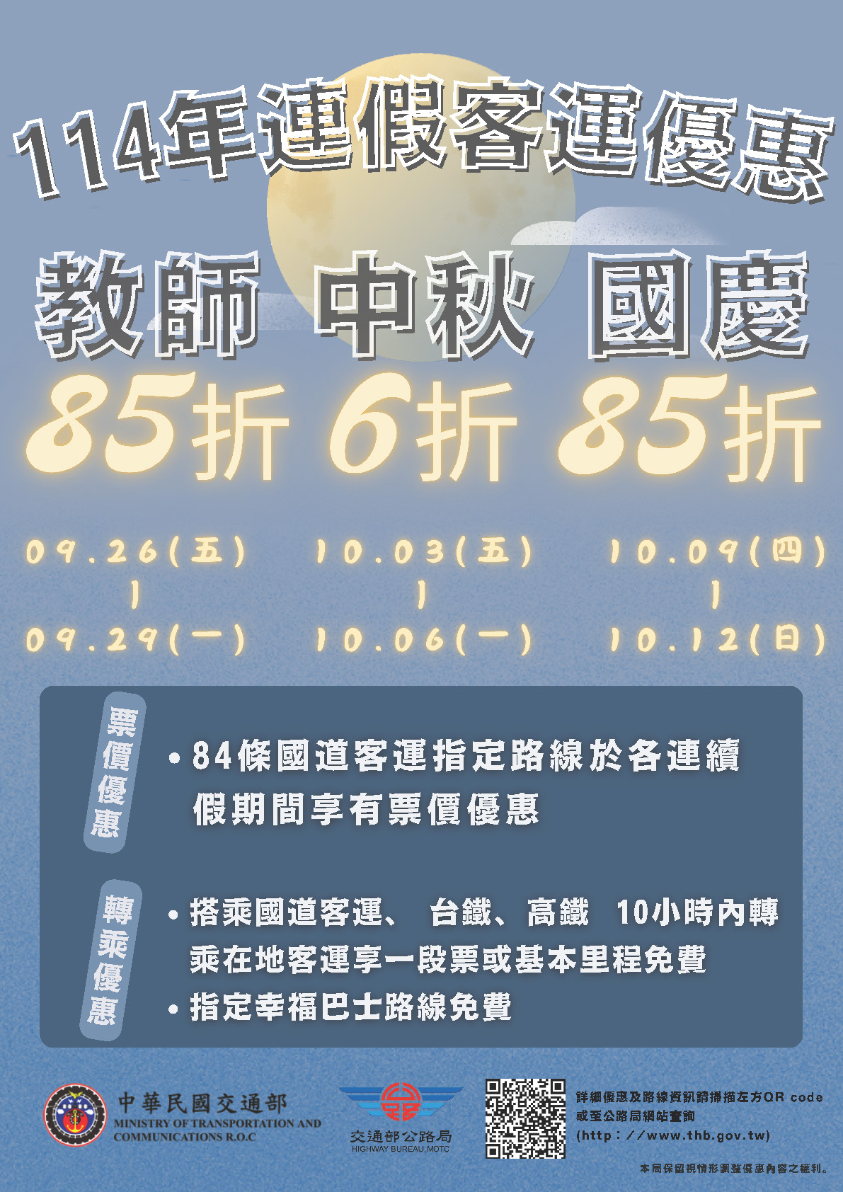 為鼓勵民眾於連假期間搭乘公共運輸及培養轉乘習慣,114年教師節、中秋節、國慶連假期間,搭乘國道客運享票價優惠及在地公車轉乘優惠,敬請多加搭乘利用。