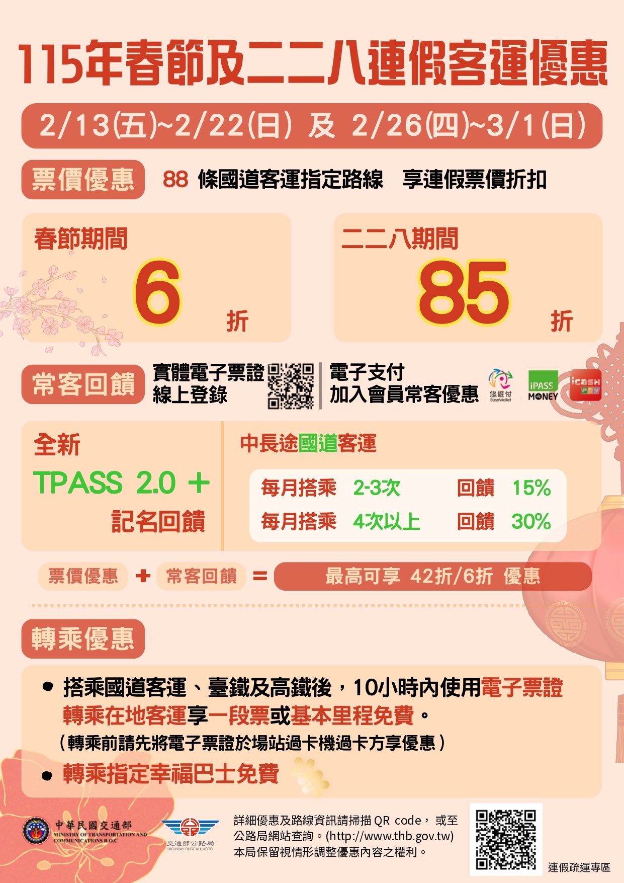 為鼓勵民眾於連假期間搭乘公共運輸及培養轉乘習慣,115年春節及二二八連假期間,搭乘國道客運享票價優惠及在地公車轉乘優惠,敬請多加搭乘利用。